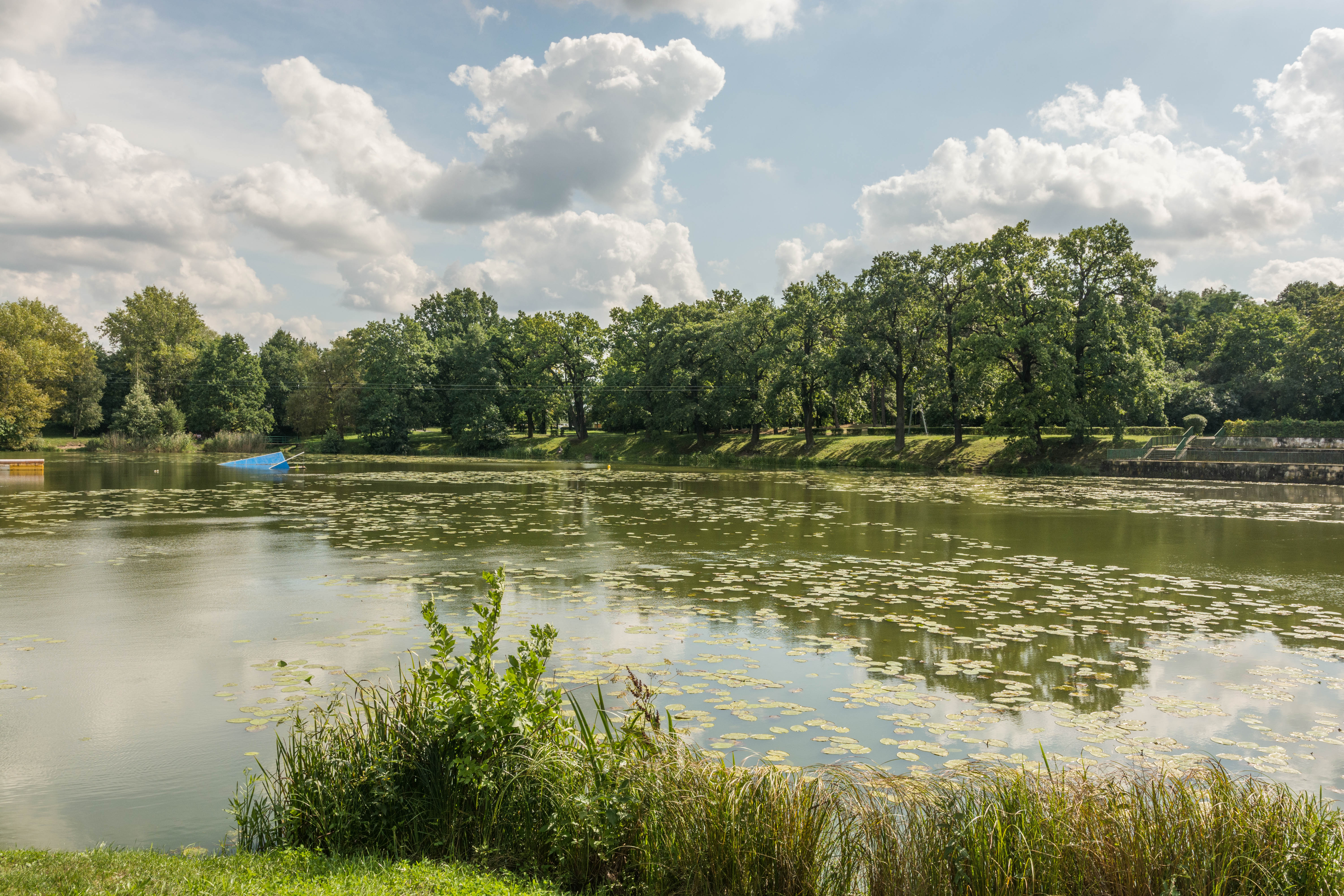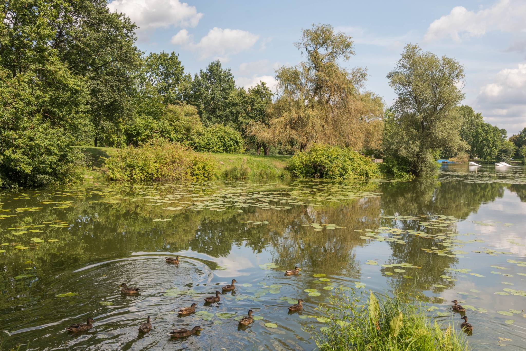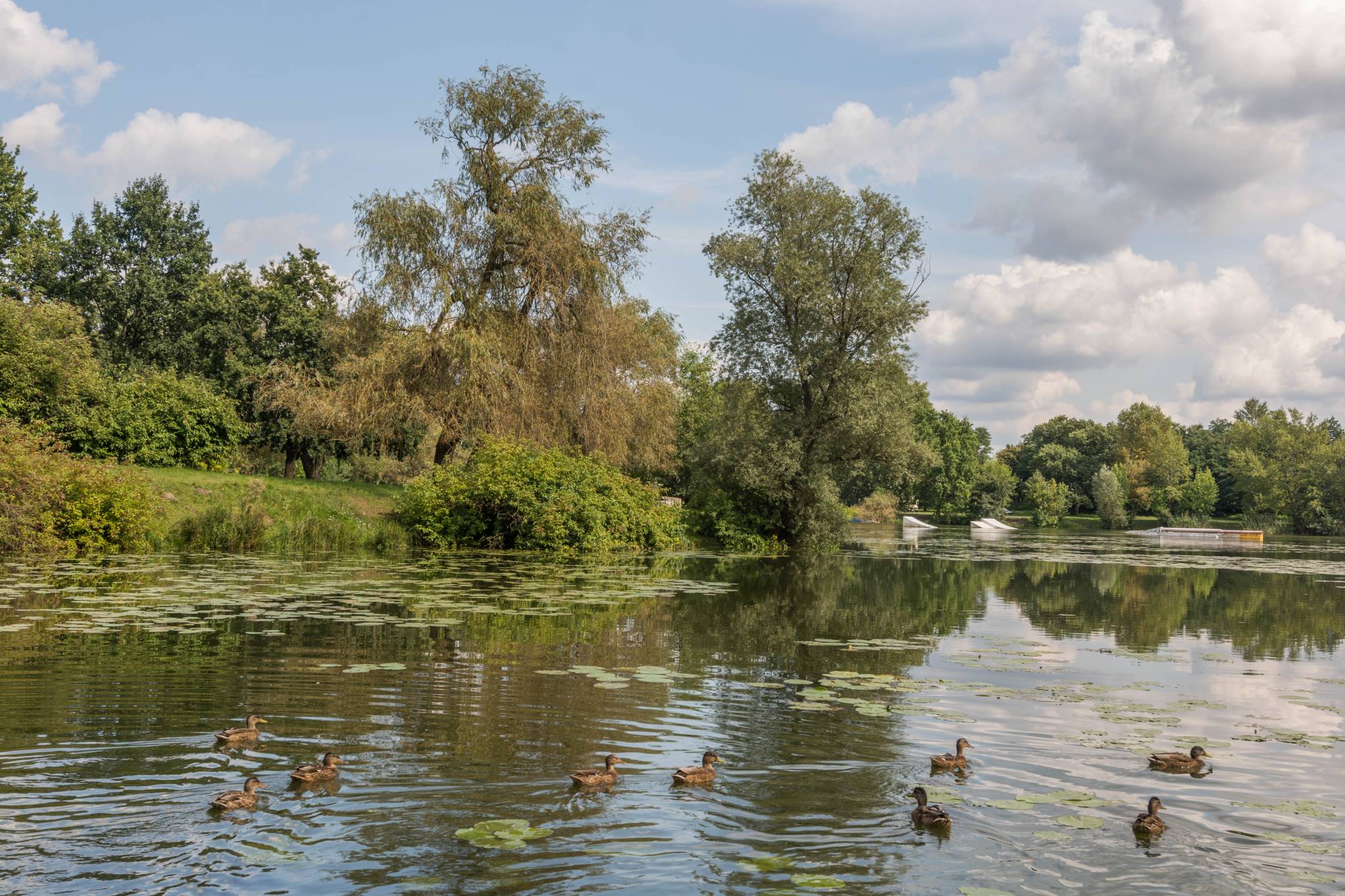 W czasach niemieckich jak i obecnie, teren był popularnym miejscem odpoczynku nowosolan, a w szczególności pracowników fabryki nici, od lat 20. XX wieku. Pierwotnie była tu duża łąka ze strumykiem. W 1936 r. na pobliskim wzniesieniu wybudowano willę dla rodziny von Treskow. Po 1945 r. obszar zyskał obecną nazwę, która jest inspirowana prawdopodobnie byłymi właścicielami terenu – zawiera ona aż cztery czarne kaczki. Trzy – ze złotymi ogonami na szyjach, są na tarczy herbowej, a czwarta jest na górze, przyozdobiona pawimi piórami. Inne źródła podają, że nazwa pochodzi z czasów niemieckich, kiedy to z uwagi na licznie przybywające tam ptactwo, nie tylko wodne, wzniesienie nazywano Vogelsberg (Ptasia Góra). W latach 70. XX wieku powstał tam sztuczny zalew oraz liczne alejki spacerowe. Już wtedy było to jedno z ulubionych miejsc odpoczynku mieszkańców oraz pracowników pobliskiej Nowosolskiej Fabryki Nici „Odra”. Kryzys i siermiężne lata 80. i 90. XX wieku doprowadziły teren do dużego zaniedbania, jednak proces przywracania mu funkcji rekreacyjnej zaczął się na przełomie wieków i nadal trwa.